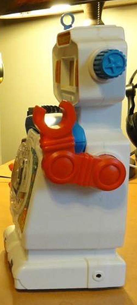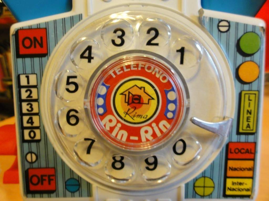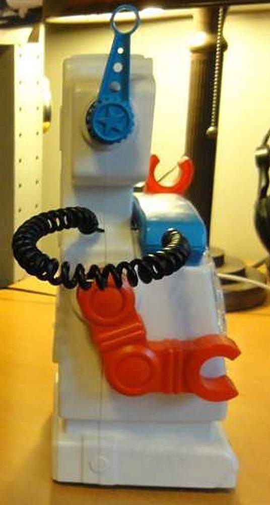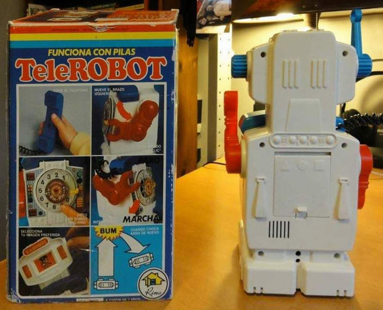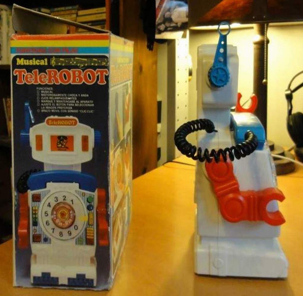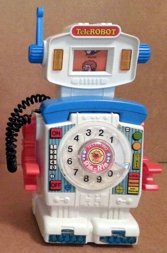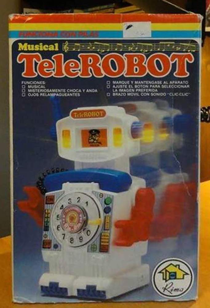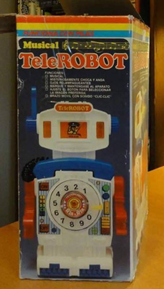 Musical TeleRobot by Rima - 1987. - When you lift its arm it plays a very loud musical loop and turns circles. Move forward, Bump 'n go action, music and sound, flashing lights in the head. Telephone is 27 cm tall.