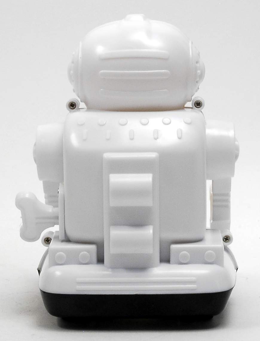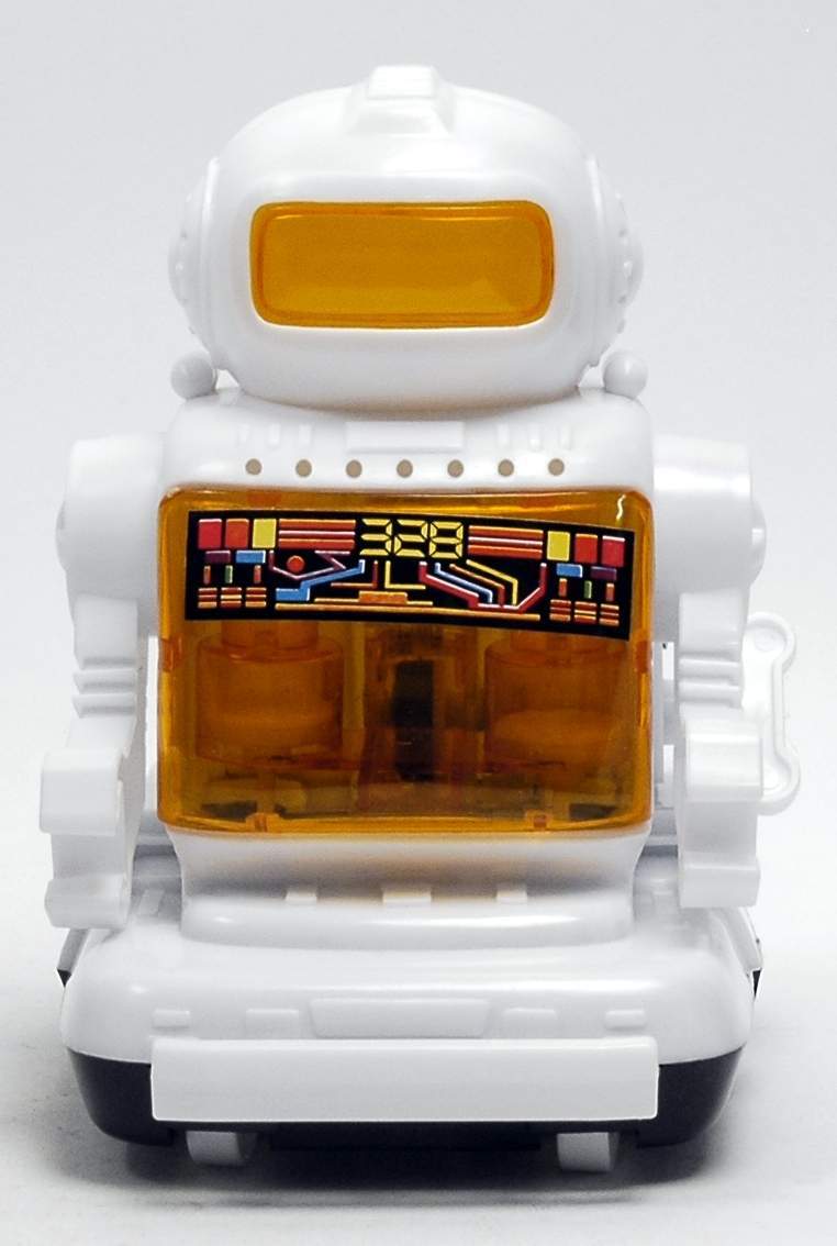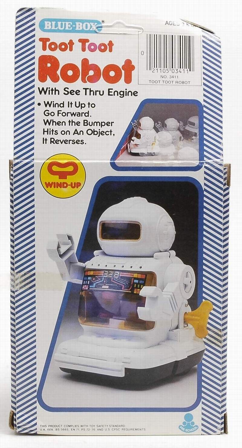 Toot Toot Robot Blue Box 1985 Macao - Toot Toot Robot, a wind-up space toy made in Macao in 1985 for Blue Box. Part no. 3411. "Toot Toot" Robot is mostly white, 6.5" tall (16.5 cm). Please see "From the Box" below for toy features and actions. Toot Toot ROBOT with See Through Engine, Wind it up to go forward. When the bumper hits on an object, it reverses.