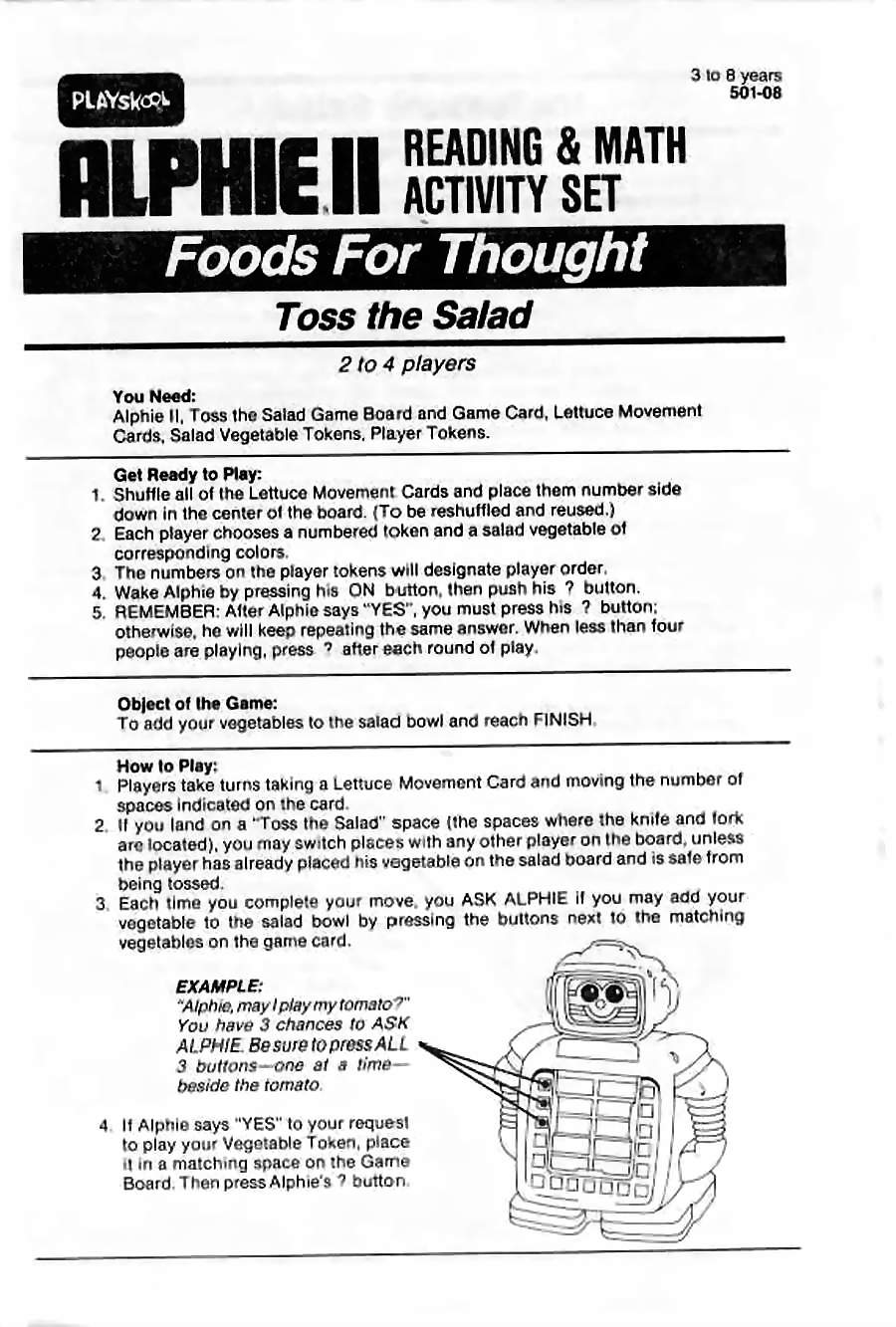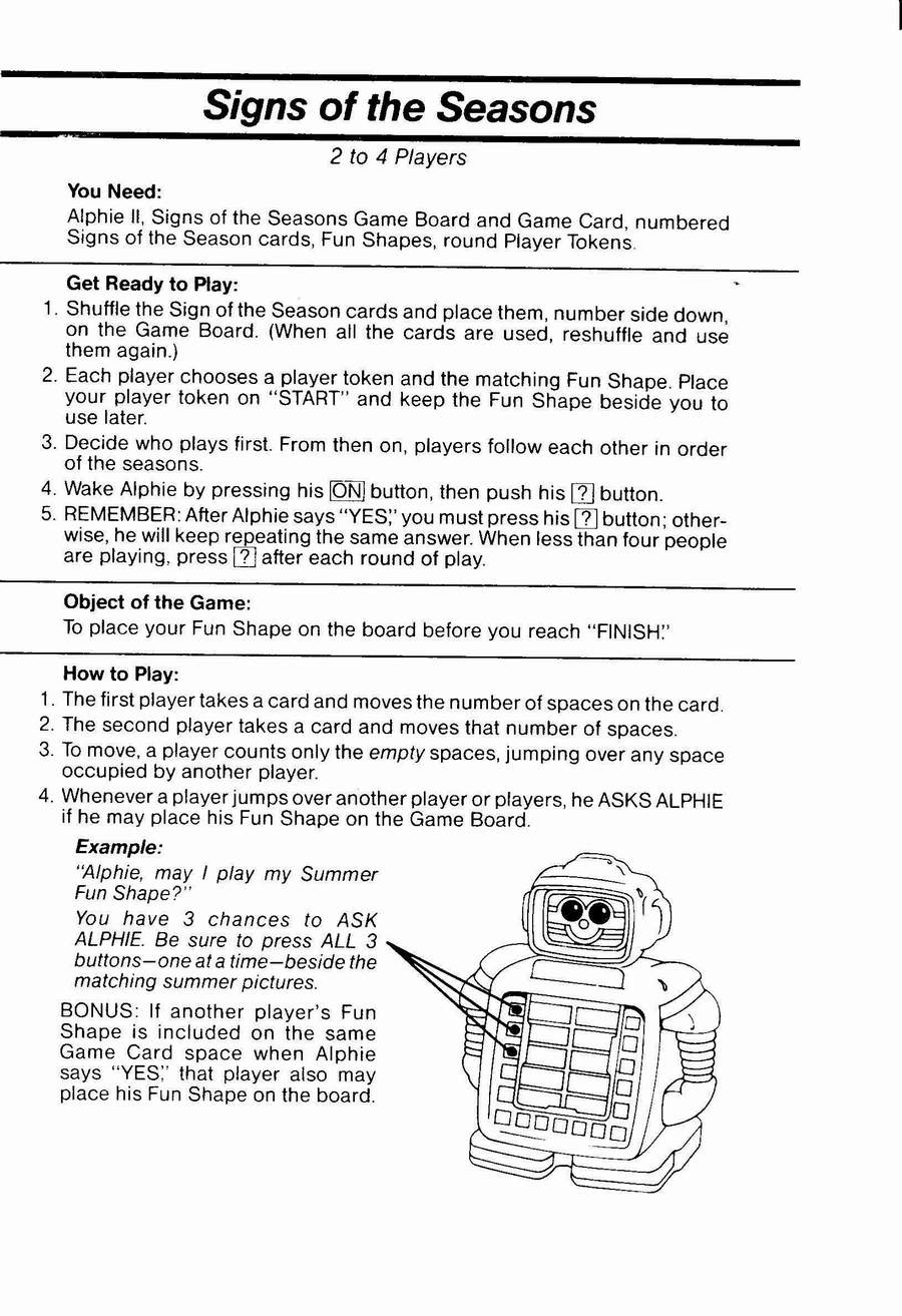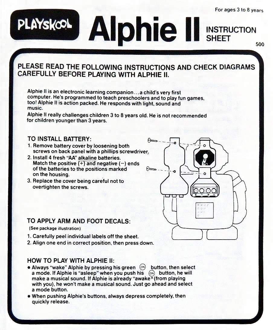 | Detailed specific information for this Robot is contained in the Instruction Manual and is available on this site. The Alphie series robots have similar functions, but the detail information can be different. This can also apply to the same model of manufactured robots, for later releases did vary with the robots. I suggest that you download the manuals for specific information. To Download Instruction Manuals Click On The Images. These files are large. They are Free. These files are as clean as I can make them, they all work for me, you download at your own risk. No Warranties Express or Implied. It is suggested that you do not Open The files in your browser window. Right Click on your mouse button and "Save Target" or "Save Link" to your computer. The file will or should start downloading/or ask you where to download to, and give you a window. All browsers will not work the same. |
