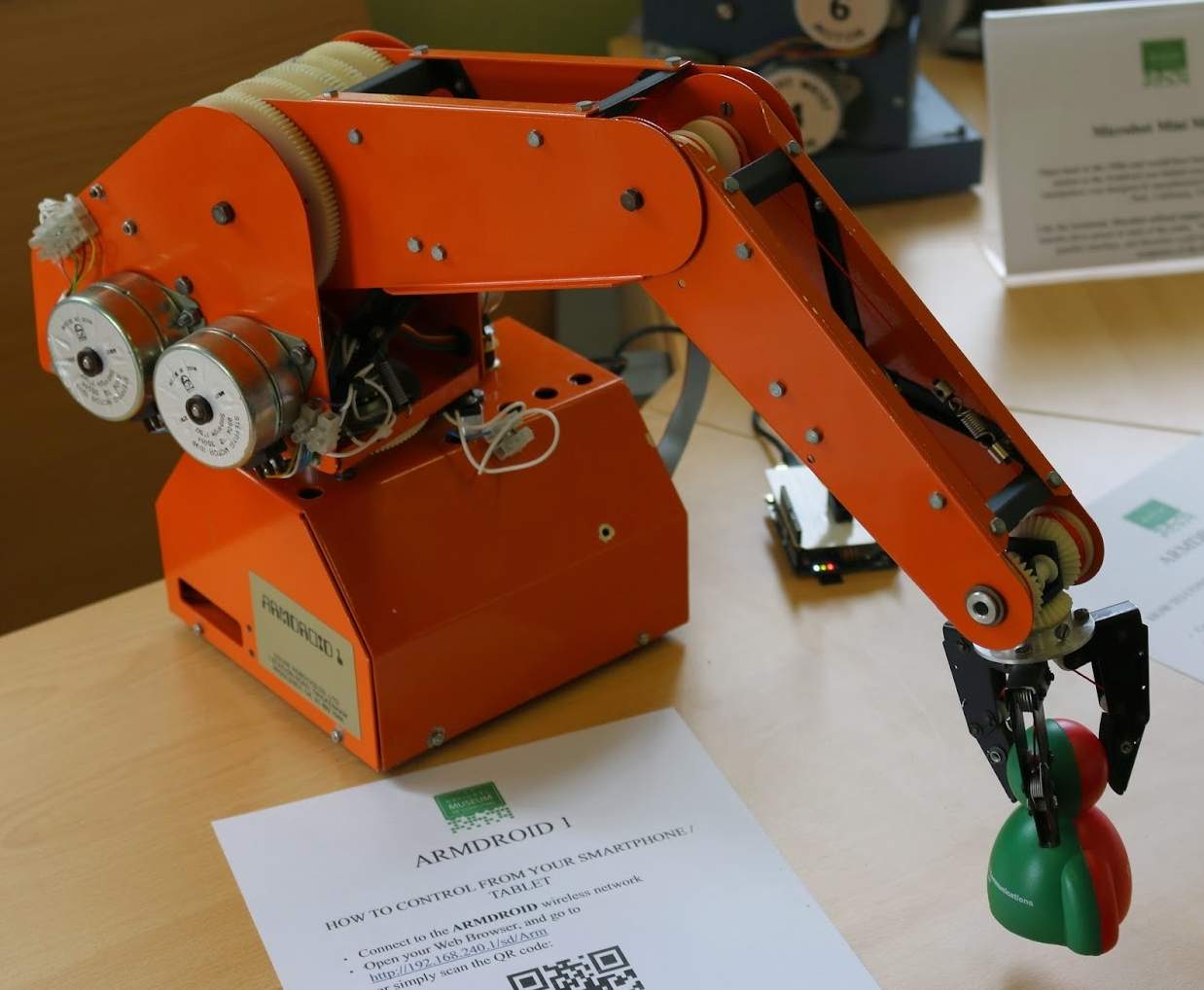 The ARMDROID I is a computer controlled manipulator with five axis of rotation and a three fingered gripper. It is a continuous path robot arm allowing all motions to be operated simultaneously. The unit can be operated under direct microcomputer keyboard control or can be taught a series of motions which can be repeated as often as desired. The rubberized three fingers can hold items of various sizes and shapes.