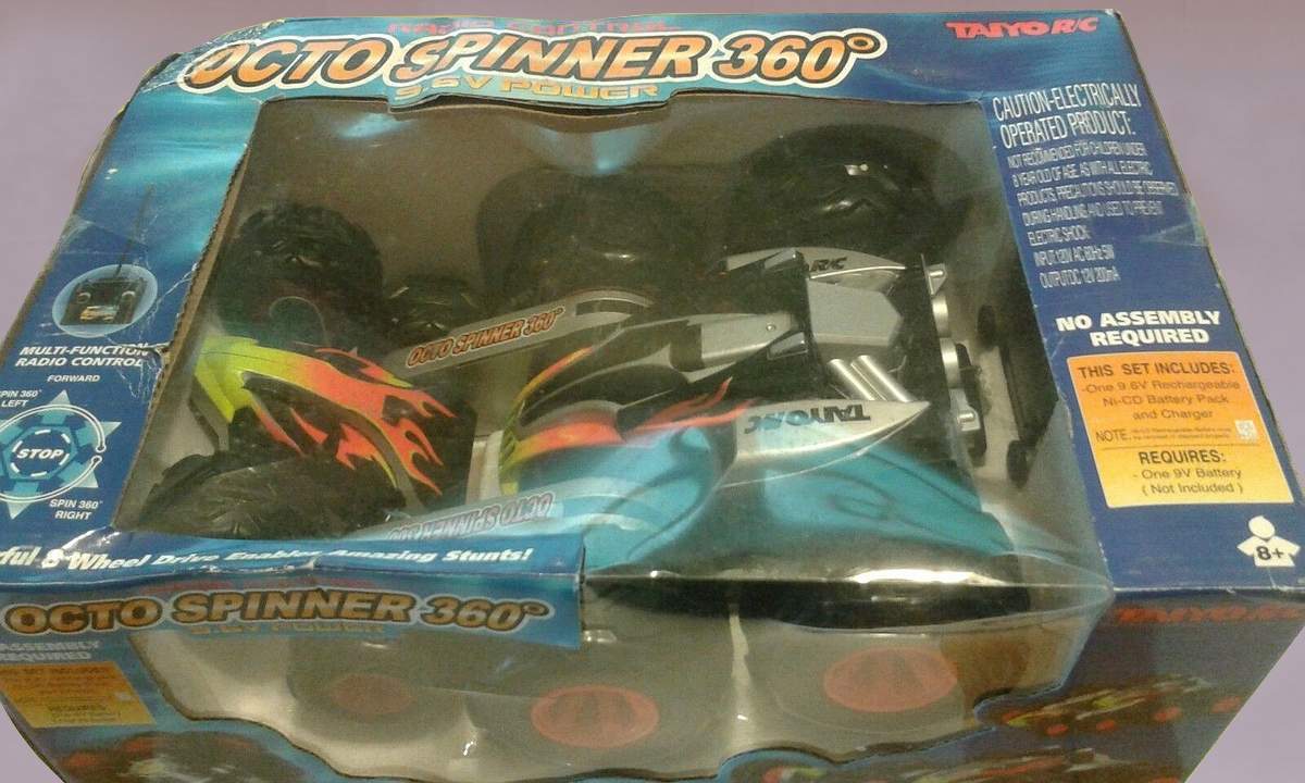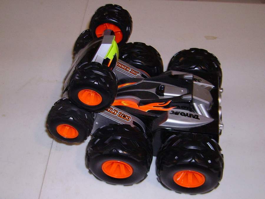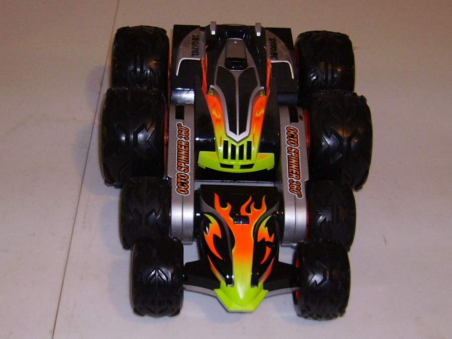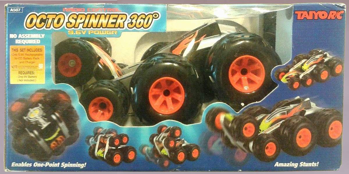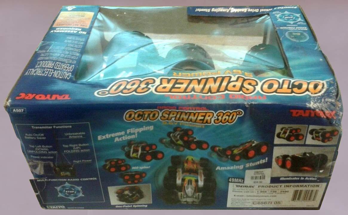 Taiyo Octo Spinner ® 360o by Talyo Kogyo Ltd. ; is a unique, 8-wheel-drive design allows vehicle to spin, flip and fold up on itself, open position delivers high speed on any surface, Folded position allows for amazing stunts, it performs 360° spins, super wheelies, spiral spins, extreme flips and rolls, built-in, super bright LED lights illuminate the bottom, 49 MHz frequency controller. High performance, 9.6V battery pack and charger. Octo Spinner ® 360o by Talyo Kogyo Ltd. |
