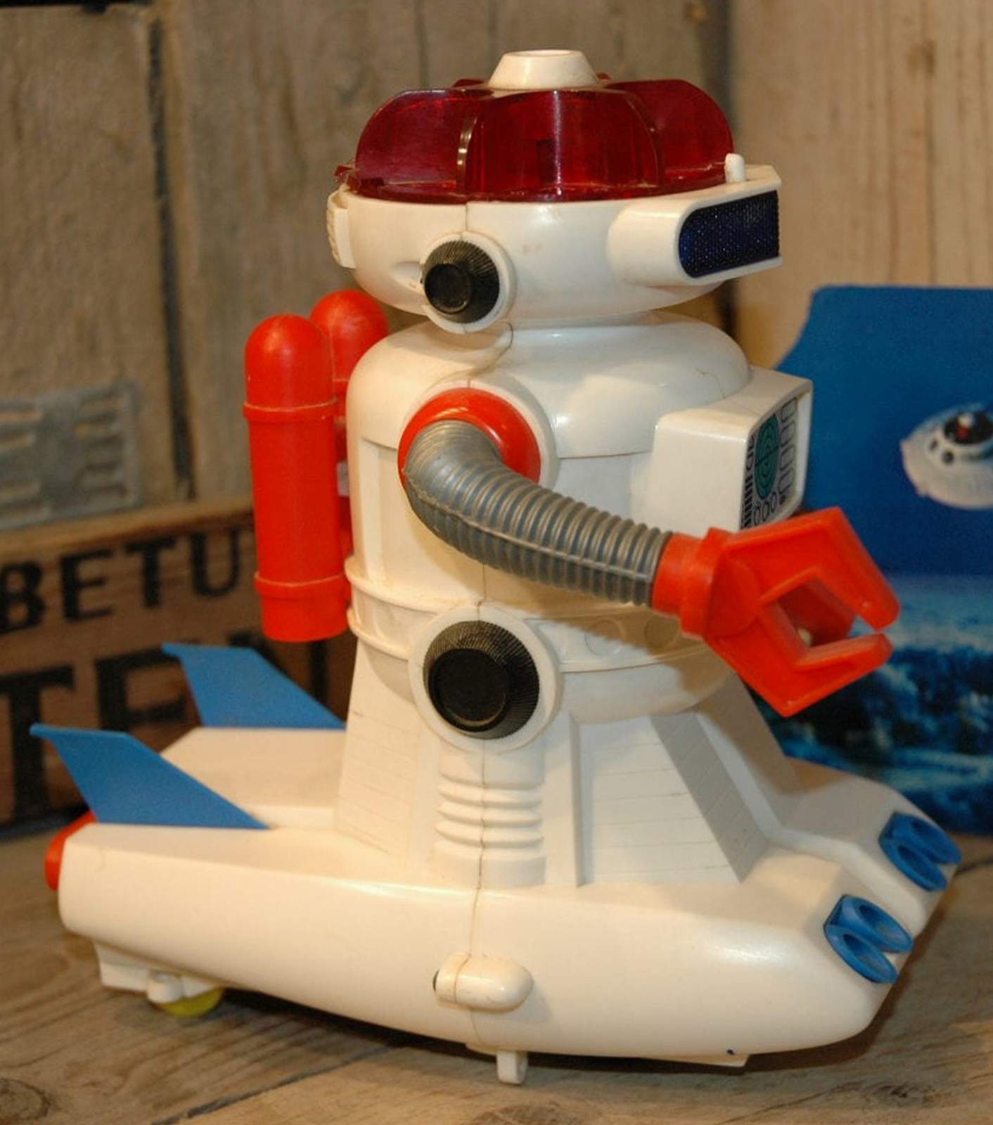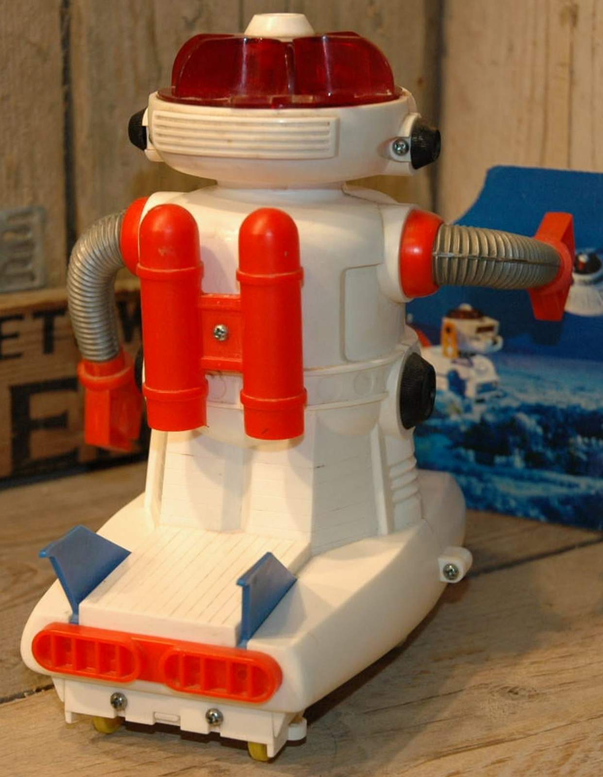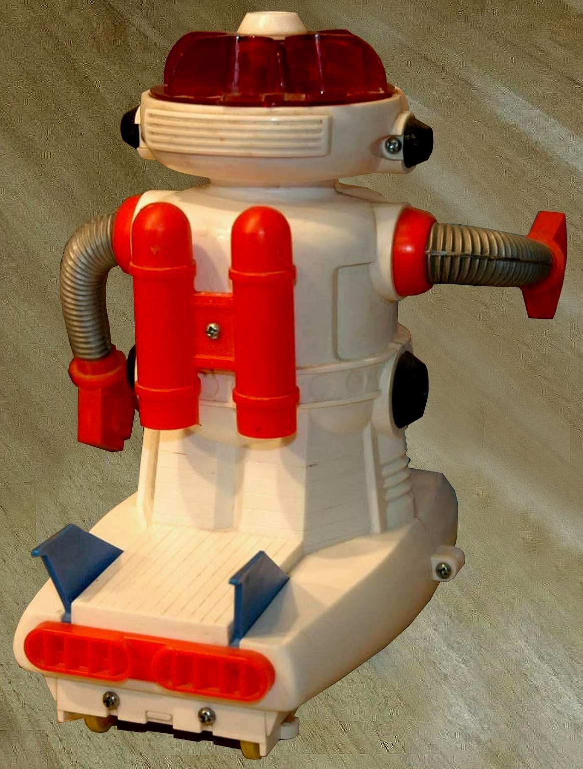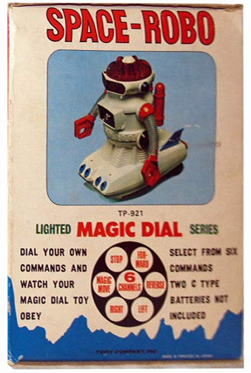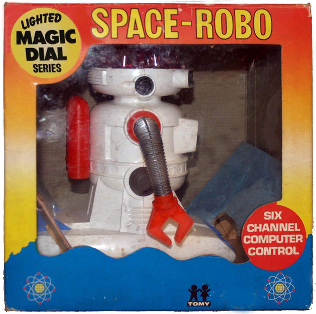 | Space Robo by Tomy - 1969; Space Robo is made out of durable platic with six (6) programmeble actions with the dial on top of the robots head. This was pretty unique for a robot in this timeframe. There is a couple of other variations of this robot, in blue, green and grey. Made in Japan by Tomy.