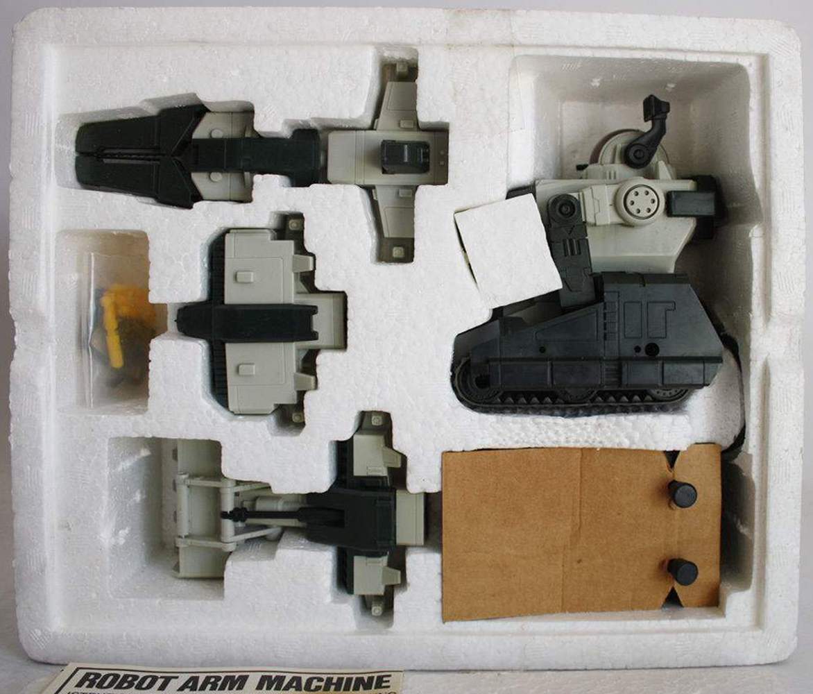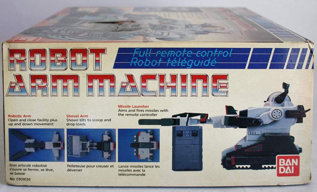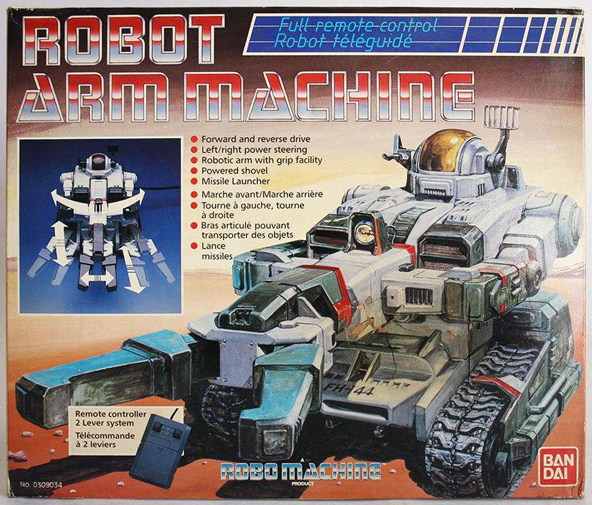 Arm Machine VWS-01 Bandi ® - © G.K. 1984; ; Robot Arm Machine; ARMROBO by Bandai - The Robot has Three Attachments: A missile launcher that REALLY shoots missiles; A Grappling arm that is able to pick up small obstacles; A Digger that can scoop up small obstacles. Made in Japan.