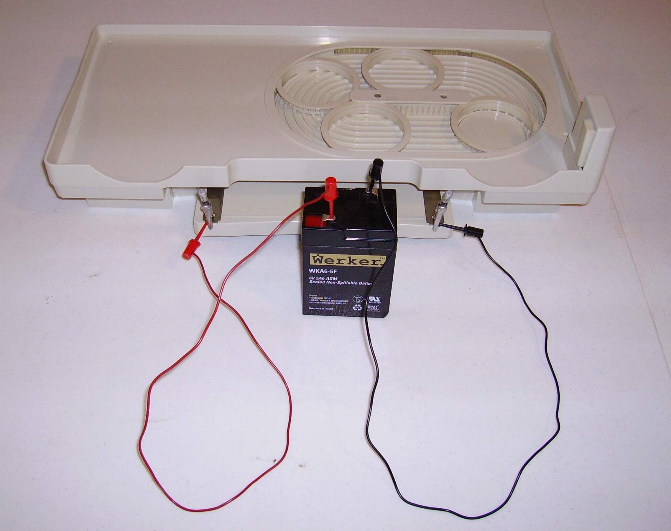 1. Hook up a 6V 4.0 AH battery to the tray. The negative side go to the terminal closest to the switch and the positive goes furthest from the switch. 2 Press the switch and hold it down for a few moments.The internal area that hold the glass on the tray should start moving and go through a complete cycle. 3. If the tray does not go through a complete cycle it is broken. |