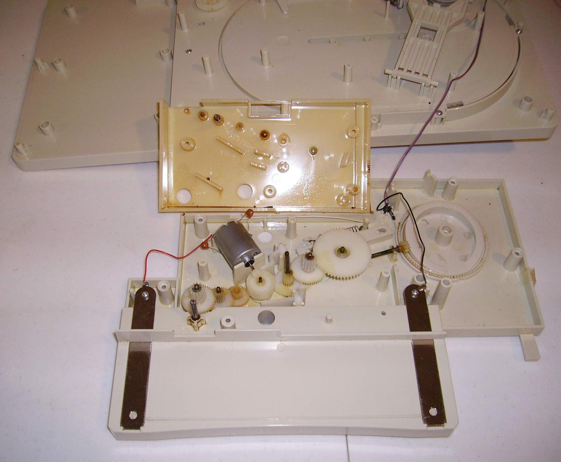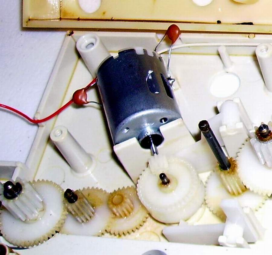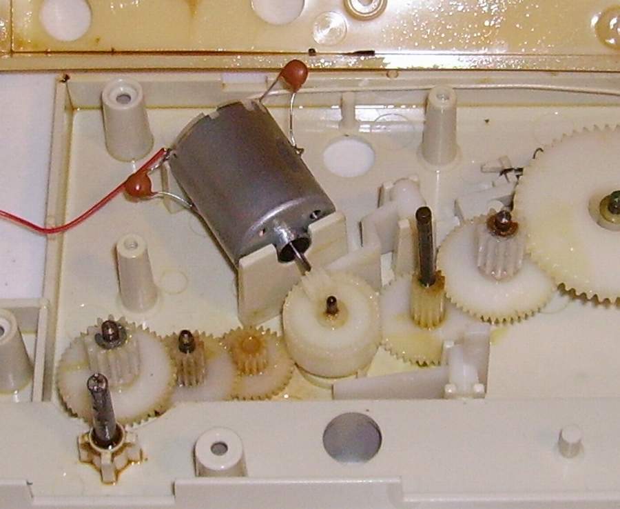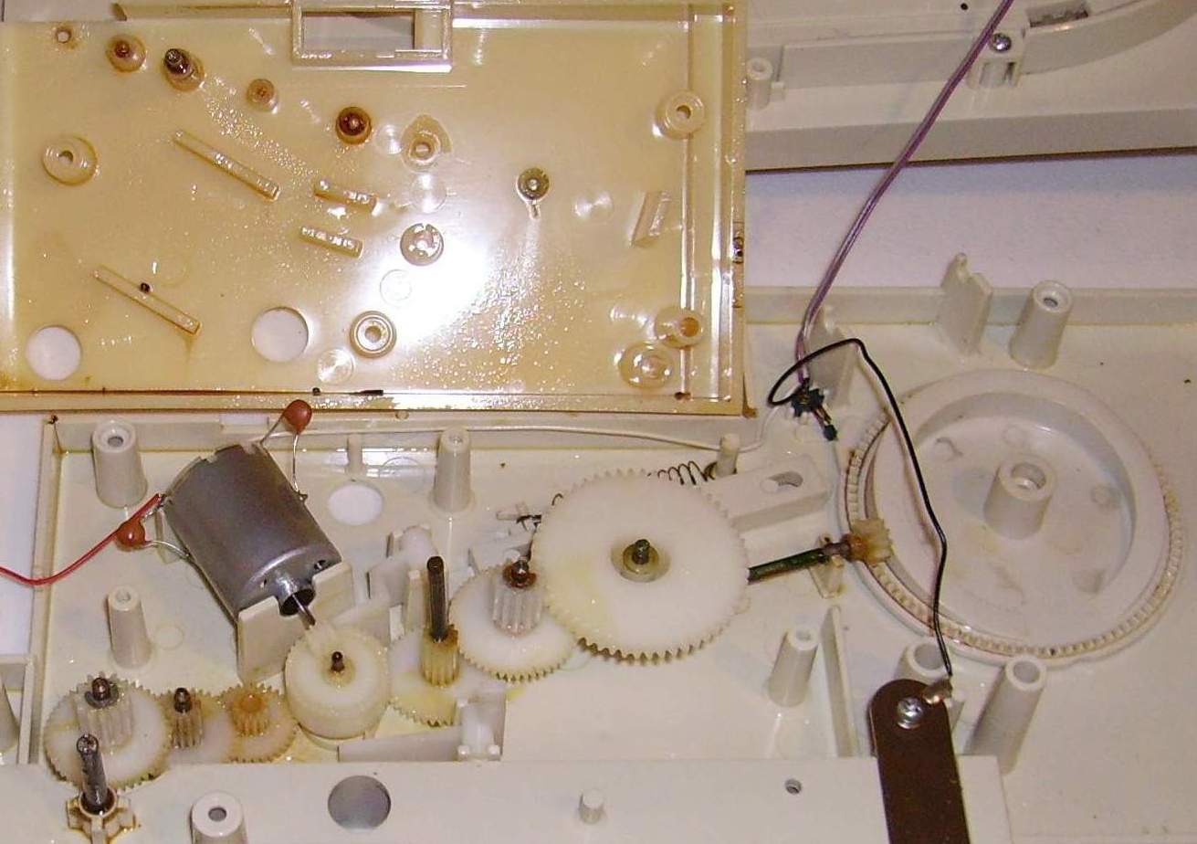 Repair of the Omnibot 2000 Tray/Motor Gear14. Remove the motor with the gear and repair. 15. Fasten the gear to the motor shaft through knurling the motor shaft. Remember this is a old gear and reinstall the motor/gear.