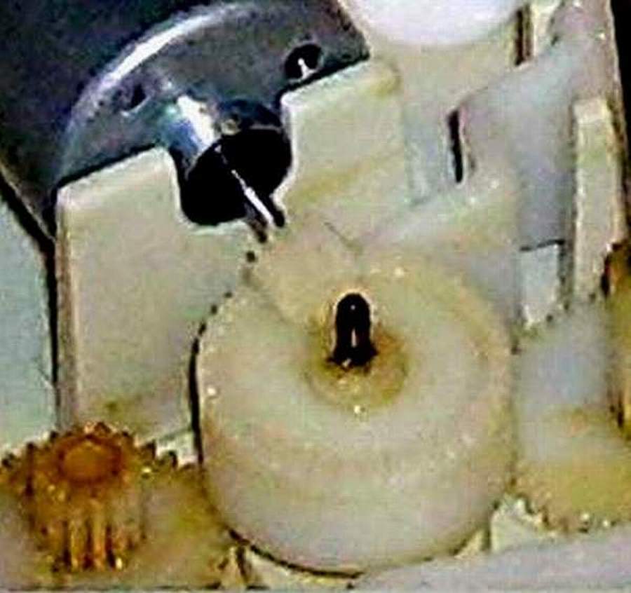 12. Inspect the box to insure that the gears mesh correctly and there are no stripped teeth on the gears. In this picture the gear on the motor is not meshing with the other gear. It is loose and slipped forward on the motor shaft. |