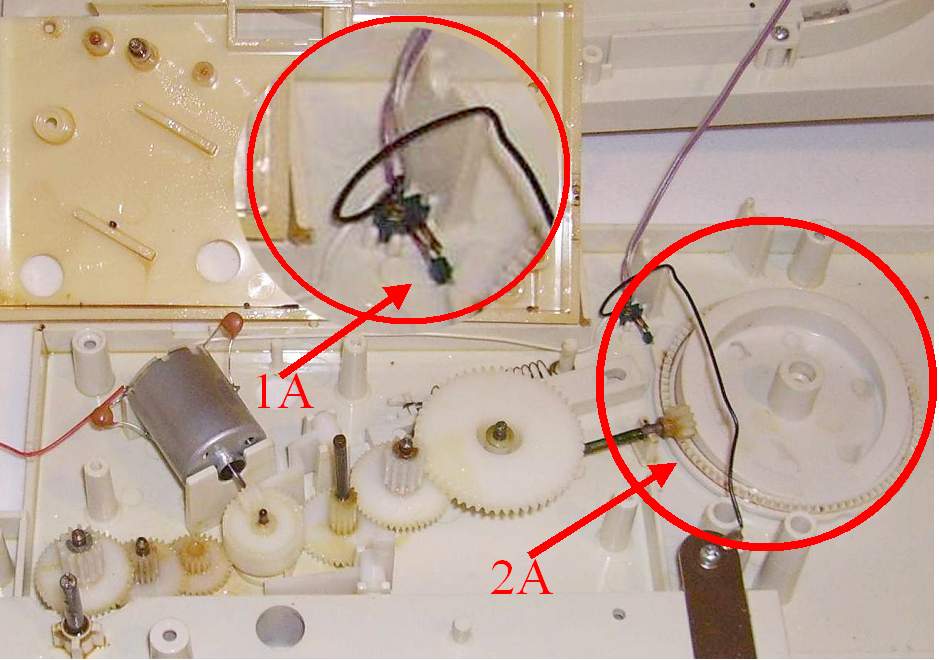 1A. This switch can be damaged if the gear travels in the wrong direction. It allows the tray to retain power on the motor until it goes through one cycle. 2A. This is the cam that travels in the counter clockwise direction. |