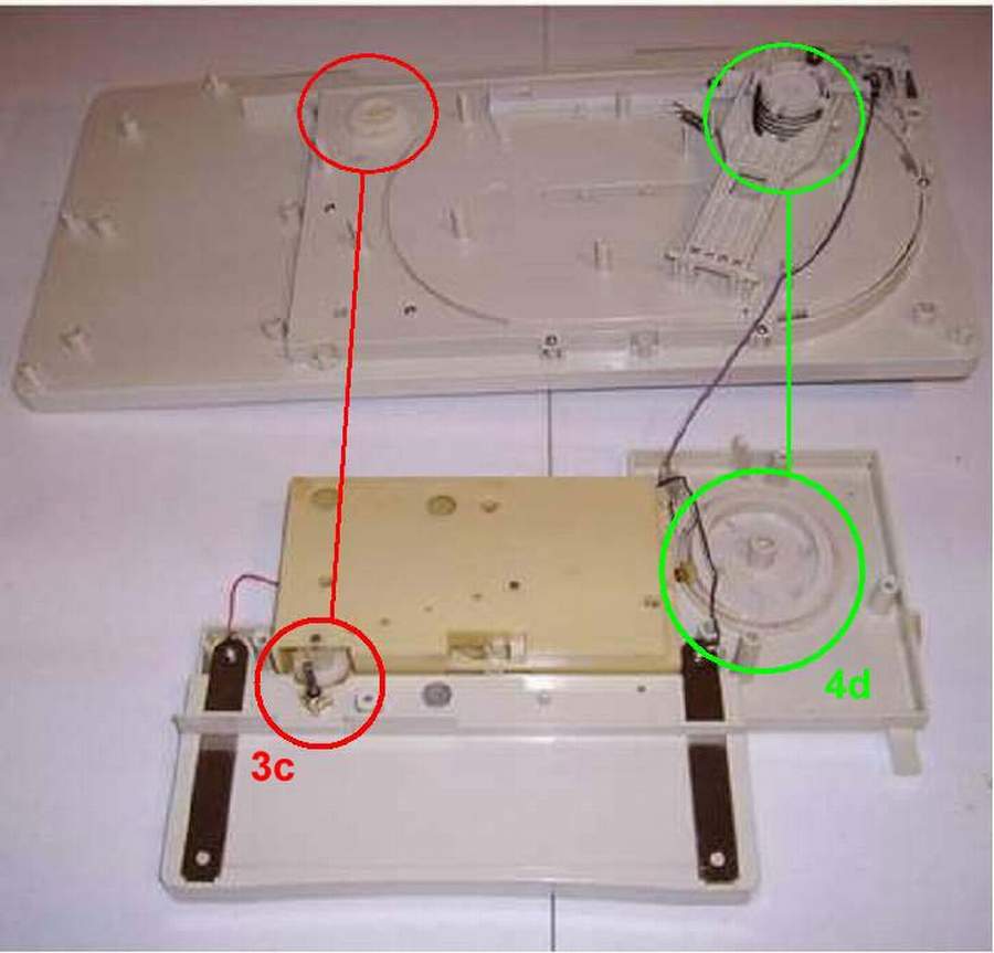 | 3C. This gear moves the travelling belt in the tray. Use this gear to move the belt. Do not move it unless needed. 4D. This is the gear/cam that moves the tray platform up and down when it is aligned. |